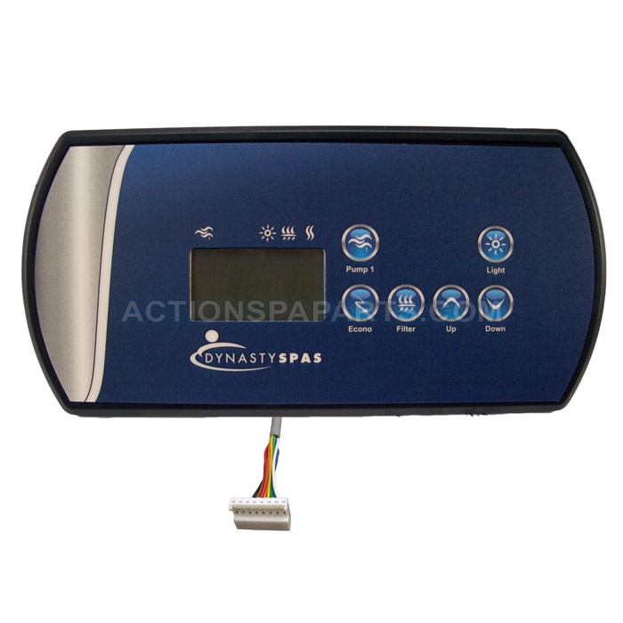 Dynasty 1 pump topside control panel with overlay for SSPA systems. 7’ cord with 8 pin JST connections. 8-5/8†x 4-1/4†Overall Size Top: Pump 1, Blank, Blank, Light Bottom: Econ, Filter, Up, Down