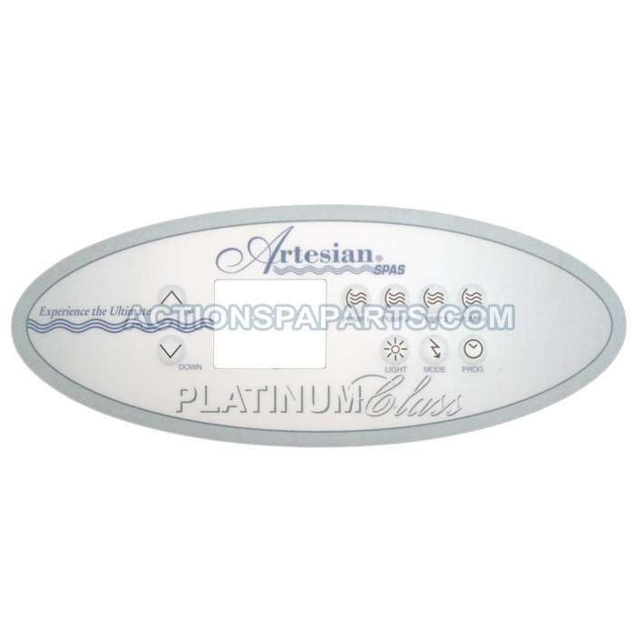 Overlay for Atersian Platinum Series, 9 Button 4 Pump Overlay Used With Panel 33-0400-40 Top Row: Up, Pump 1, Pump 2, Pump 3, Pump 4 Bottom Row: Down, - , Light Mode, Program 10-5/8" x 4-1/8"Manufacturer: ArtesianMPN: OP11-0100-77