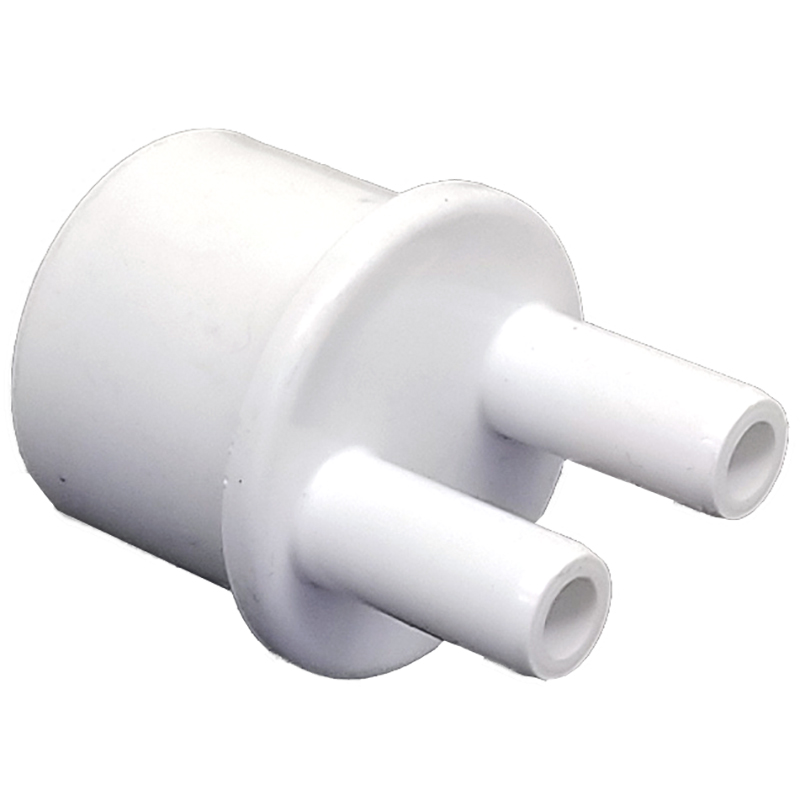 1" Spigot with (2) 3/8" smooth barb ports and barb plugs.